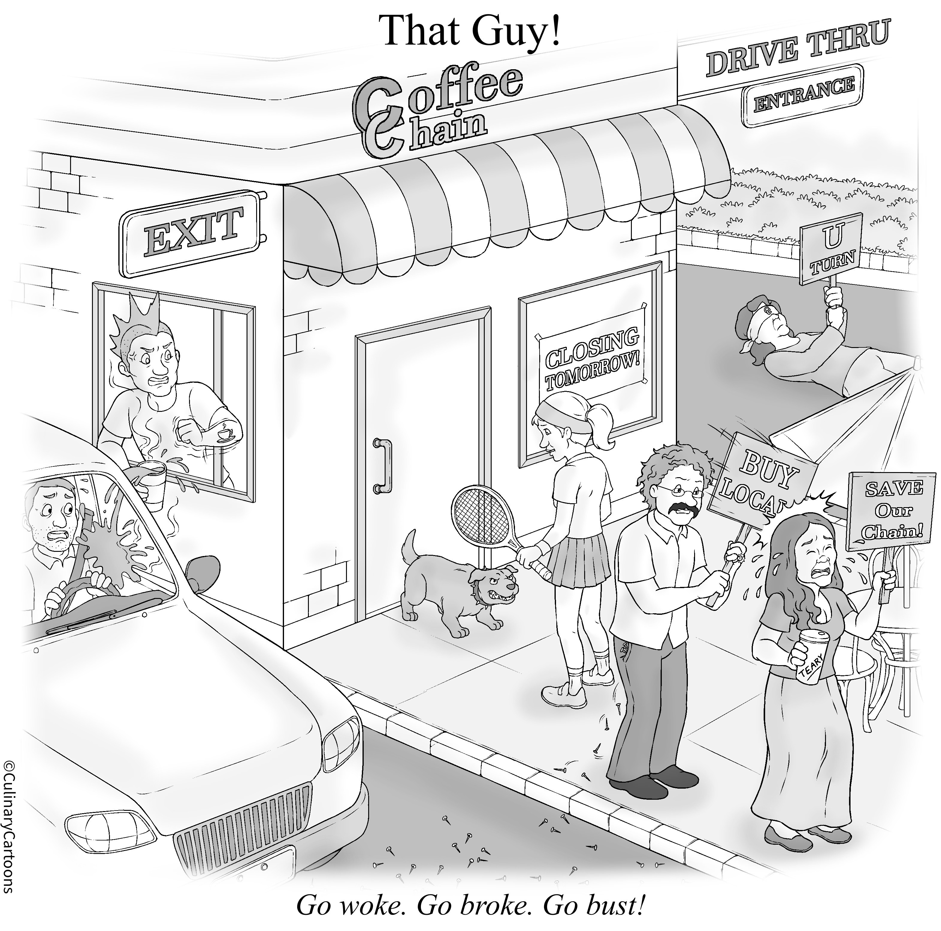 This month’s toon was inspired by the closing of a corporate coffee chain’s store in my neighborhood. The company announced hundreds of closings with only a day’s notice. It was no loss to most of us because we never entered or drove through it.