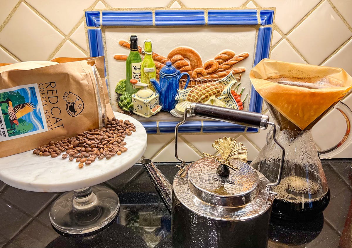 For the pour over, I purchased a Michael Aram teapot for boiling the water from my Sans Countertop Reverse Osmosis Water Filtration System. And I warm and froth our cream by hand in my Mauviel Copper Sugar Pot. After coffee the pots for coffee and creamer go in the dishwasher. And my Arman pot remains on the stove. It is much prettier to look at than a big coffeemaker. And my island is not filled with electrics and their noisiness. Making and drinking coffee in the morning is now a quiet, sustainable ritual. And I sip Alabama Audubon Blend as I watch the winter birds outside. The only thing missing is a Red Cat in my neighborhood.